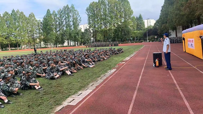 消防安全模块则通过“理论宣讲+实景演练”层层递进。安全管理处工作人员结合校园火灾案例,系统讲解火灾成因、预防要点、报警流程等消防安全知识,重点强调学生公寓用电安全规范。在模拟灭火现场,工作人员详细介绍干粉灭火器的适用范围与提、拔、握、压操作要领,设置模拟火源组织新生分组实操,让每位新生都能亲身体验初期火灾扑救过程。在模拟应急疏散演练中,新生们弯腰低姿,沿着疏散标志快速有序撤离至指定安全区域,全程衔接紧密、秩序井然。