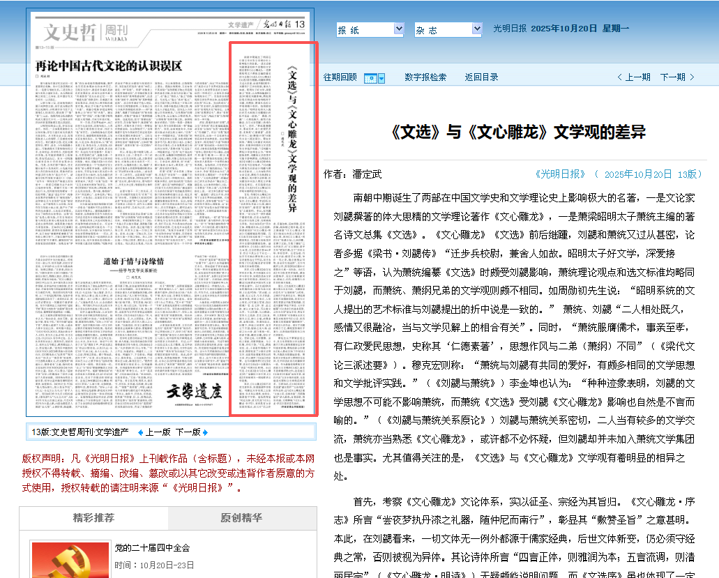 10月20日,《光明日报》第13版:文史哲周刊·文学遗产刊登我校教授潘定武的学术文章,题为“《文选》与《文心雕龙》文学观的差异”。该文对南北朝时期这两部集大成的文学典籍进行了细致的比较,揭示出二者文学观上的明显差异。