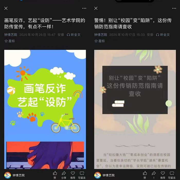 10月,艺术学院以 “远离传销陷阱,守护青春梦想” 为主题,开展了为期1个月的防范传销系列活动,通过主题班会、海报设计大赛、新媒体宣传等多种形式,构建起全方位、多层次的宣传教育体系,取得了显著成效。